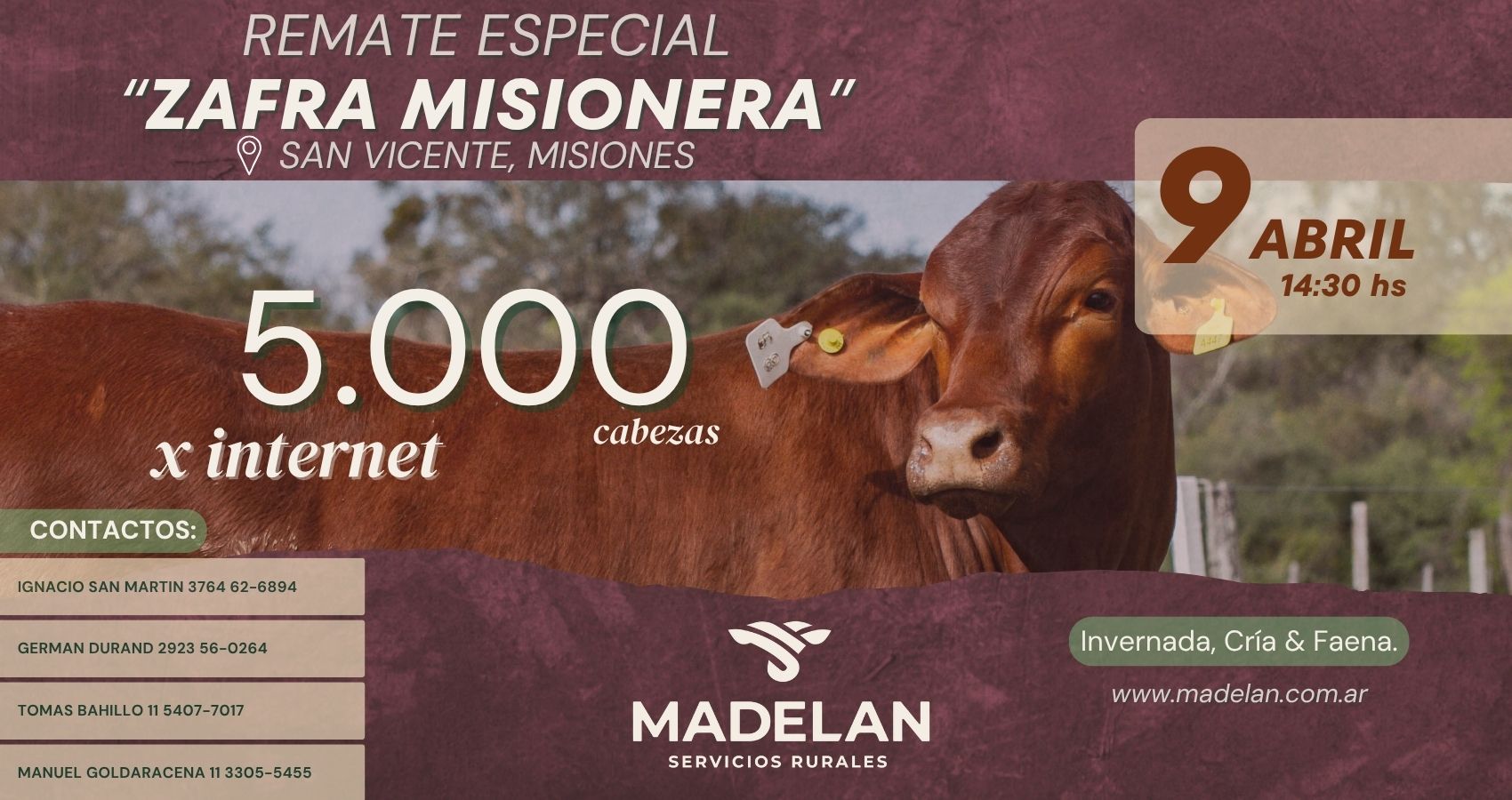 | 6 | 40 | Ternero | Cruza Braford/brangus | Invernada | 175 | $ 6.000 | Montecarlo - Misiones | 25 y 55 dias | |